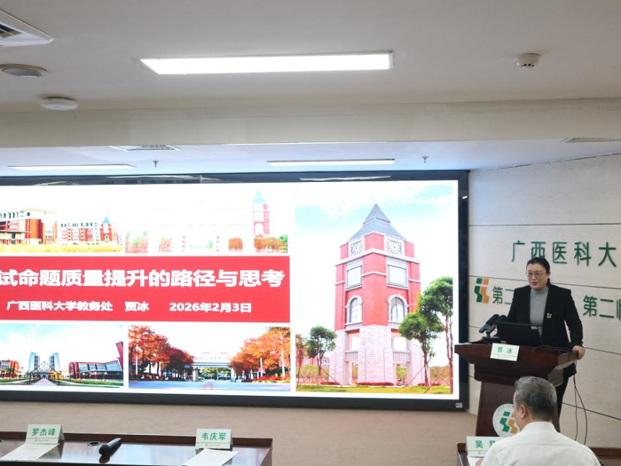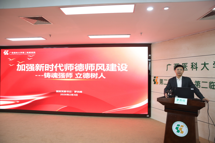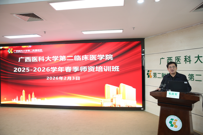 2026年1月30日-2月10日,二附院2025-2026学年秋季学期师资培训班举行。医院党委书记罗杰峰、院长韦庆军出席开班仪式,全院各教研室主任、副主任、秘书及教师150余人参加培训,吴易副院长主持开班仪式。