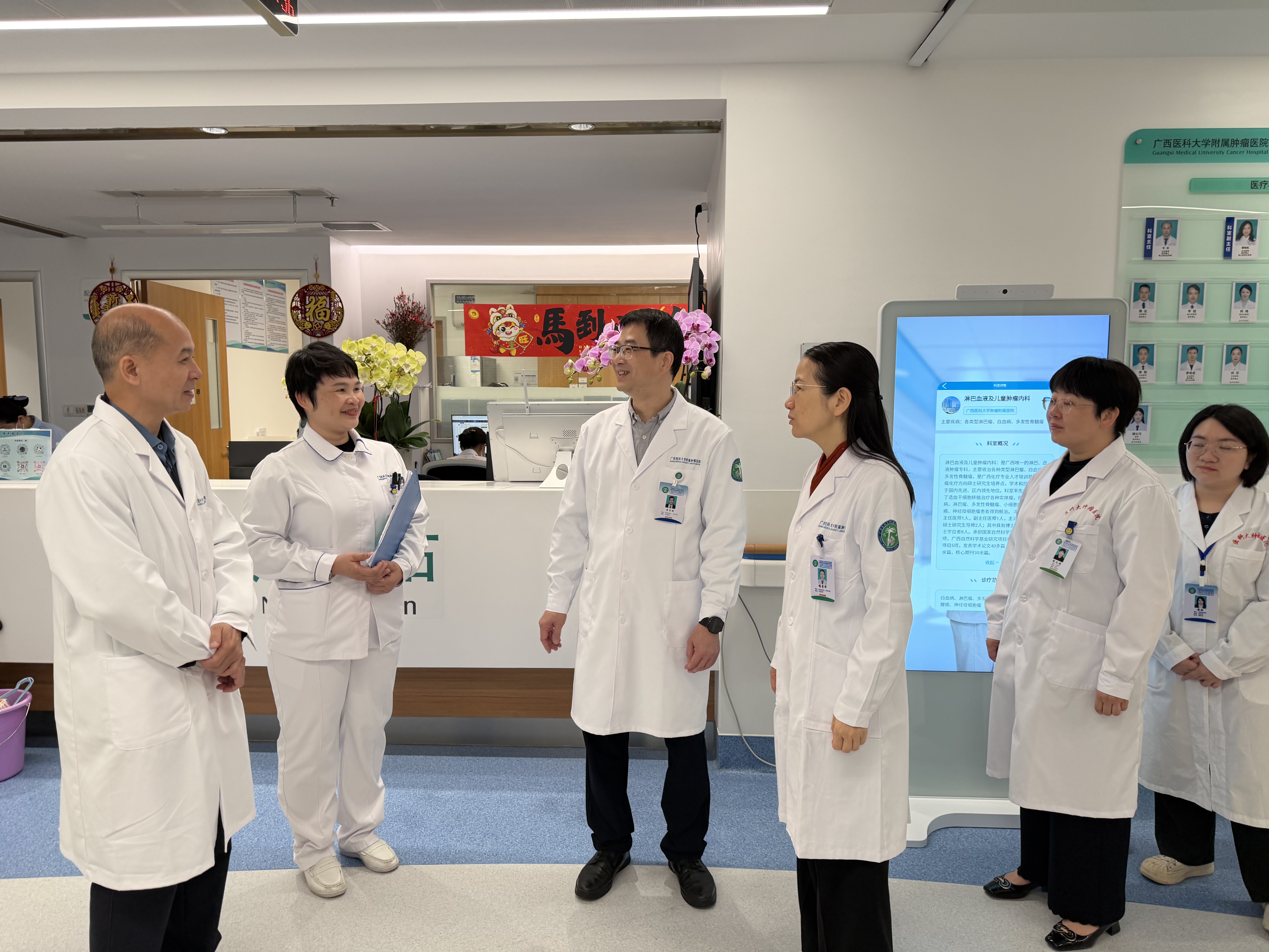 春意渐浓,万象更新。2月24日,农历新春后的首个工作日,附属肿瘤医院党委书记黄勇、院长唐勇带领全体领导班子成员及相关职能部门负责人,带着浓浓的关怀与新春的祝福,深入五象院区、青秀院区各临床医技科室及行政职能部门,看望慰问一线医务人员,勉励全院上下以“起步即冲刺、开局即决战”的奋斗姿态,奋力谱写医院高质量发展新篇章。