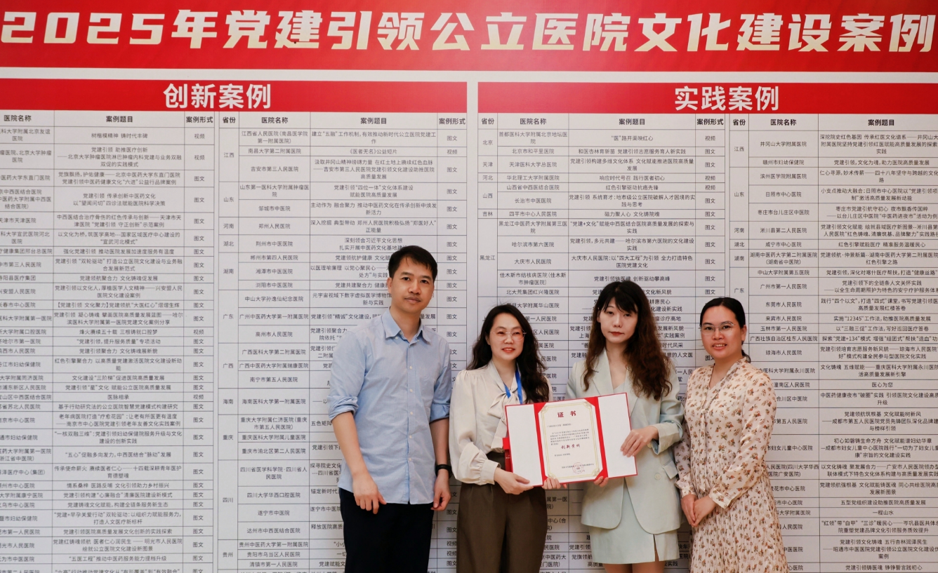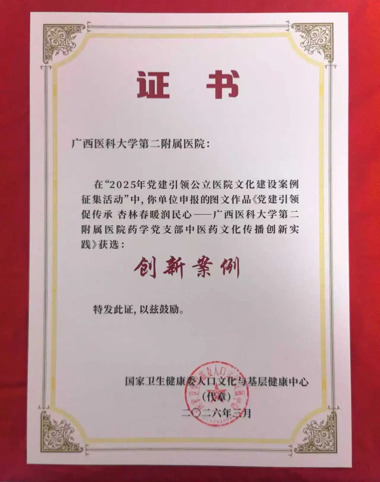 3月28日,由国家卫生健康委人口文化与基层健康中心主办的2025-2026党建引领公立医院文化建设经验交流活动会在南宁举行,Beat365中文官方网站第二附属医院药学党支部选送的《党建引领促传承 杏林春暖润民心——中医药文化传播创新实践项目》,从众多参赛作品中脱颖而出,荣获大会创新案例。
