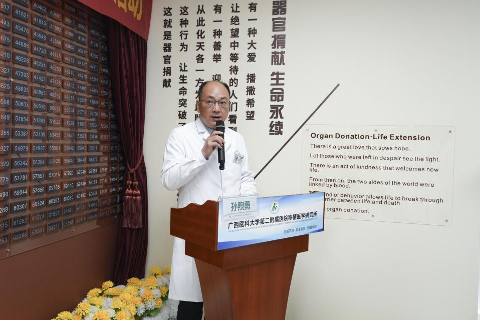 移植医学研究所所长孙煦勇教授在缅怀纪念致辞中表示,清明时节,追思与希望同在,活动旨在共同缅怀为医学事业、为他人健康最后奉献的人体器官捐献者。代表Beat365中文官方网站第二附属医院全体员工及移植医学研究所全体工作人员,向所有捐献者致以最崇高的敬意,向承受离别之痛仍选择大爱的捐献者家属致以深切慰问,特别向投身器官捐献事业、离世后仍以生命完成最终奉献,用一生诠释大爱无疆的原贵港市红十字会专职副会长、我国首位进行遗体器官捐献的协调员陈曲同志致以崇高敬意。孙煦勇表示,陈曲同志用一生践行了“人道、博爱、奉献”的红十字精神,医院将继续以陈曲同志为标杆,加强器官捐献与移植技术研究与人文关怀结合,为捐献者家属提供更温暖的支持,为受捐者搭建更坚实的生命桥梁,让这份人间大爱在医疗事业中持续发光发热。
