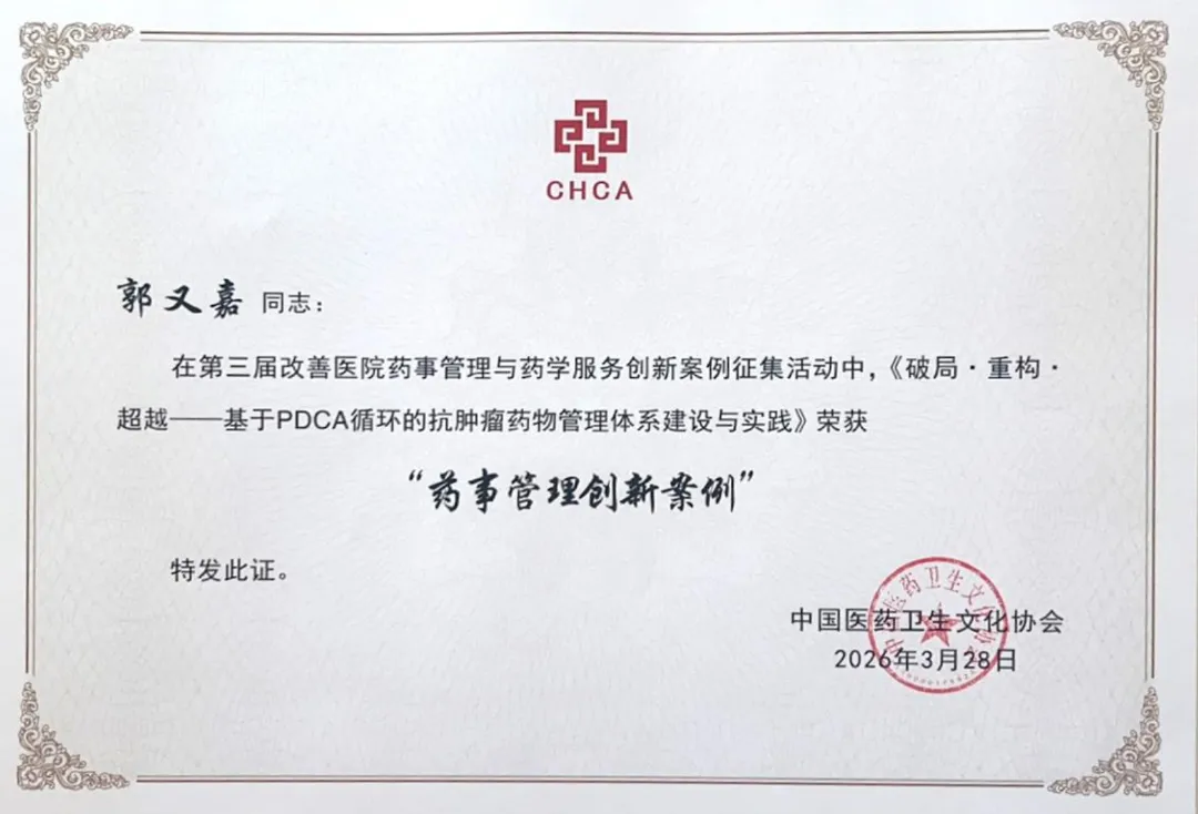 近日,第三届改善医院药事管理与药学服务创新案例征集项目在北京落幕。Beat365中文官方网站附属肿瘤医院药学部申报的案例《破局·重构·超越——基于PDCA循环的抗肿瘤药物管理体系建设与实践》脱颖而出,以总分第一名荣获“药事管理创新奖”。