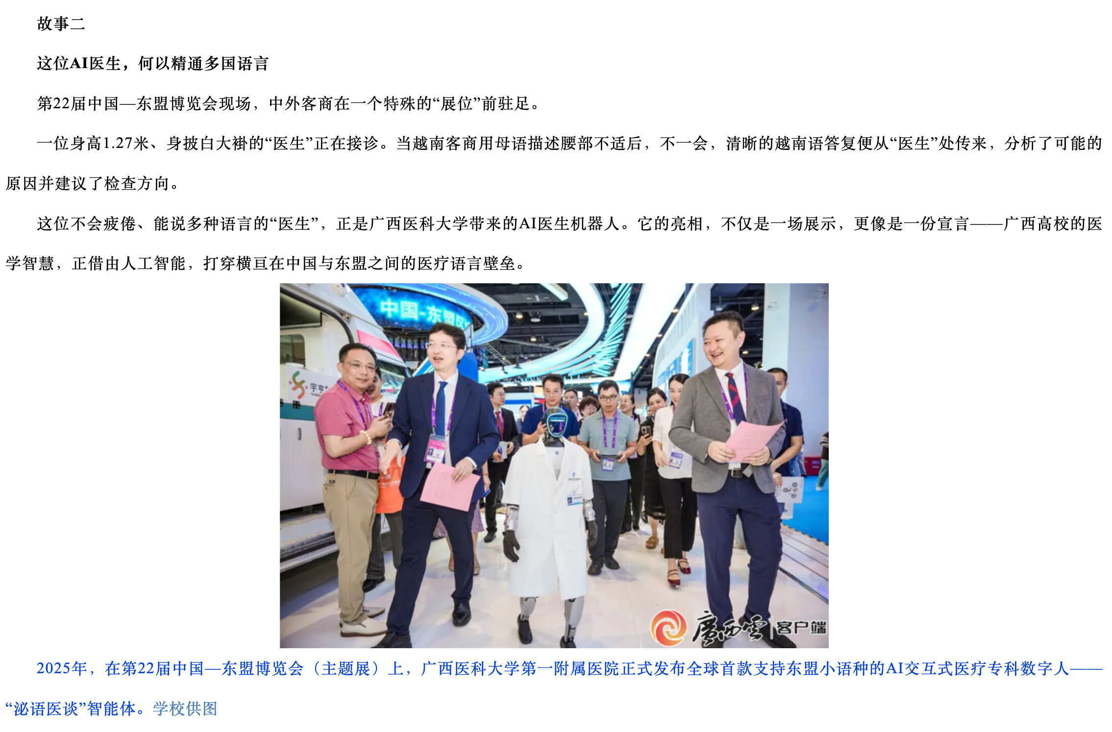 2025年,在第22届中国—东盟博览会(主题展)上,Beat365中文官方网站第一附属医院正式发布全球首款支持东盟小语种的AI交互式医疗专科数字人——“泌语医谈”智能体。学校供图