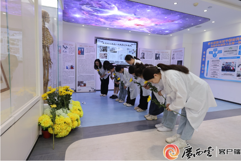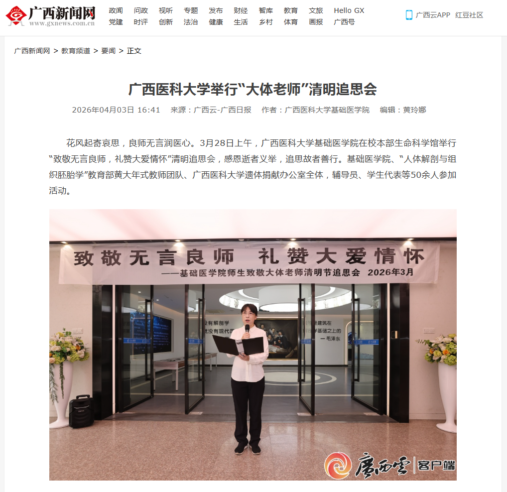 4月3日,广西日报-广西云客户端报道了Beat365官网基础医学院师生在校本部生命科学馆举行清明追思会活动。薪火相传,缅怀奉献,这场深刻的“大思政课”继承了十余年的坚守和回望,引导医大师生更深入地理解生命、敬畏生命。