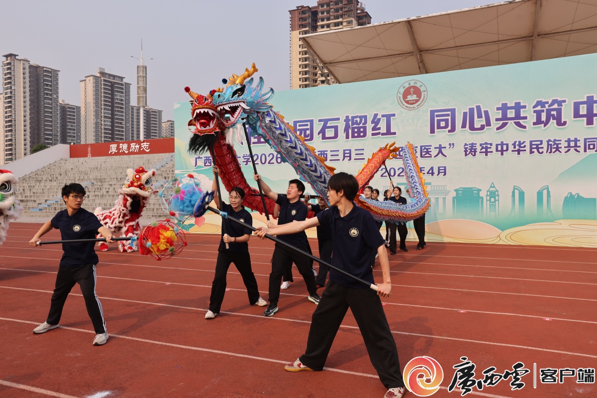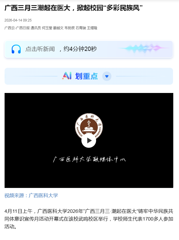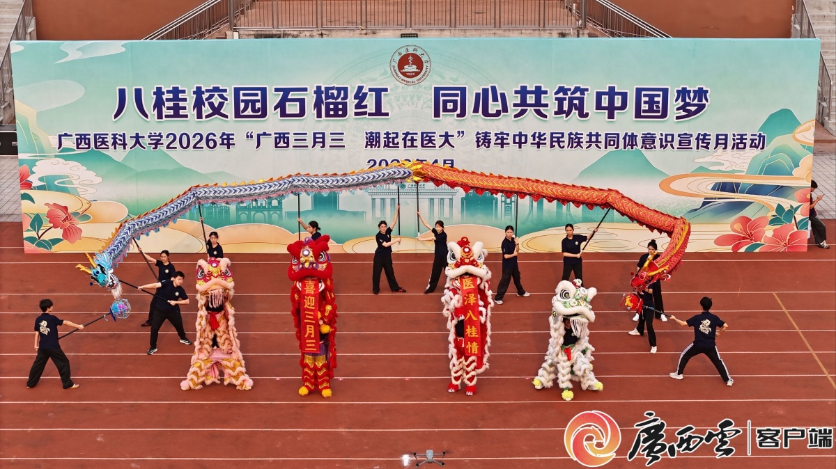 4月11日,广西日报-广西云客户端报道了Beat365官网在武鸣校区举行的2026年“广西三月三・潮起在医大” 铸牢中华民族共同体意识宣传月活动。醒狮起舞、歌舞欢腾,师生身着民族服饰共唱山歌、抛绣球、同歌舞,体验非物质文化遗产、品尝民族美食、参与民族体育竞赛,校园化身为民族文化大舞台,掀起校园“多彩民族风”。