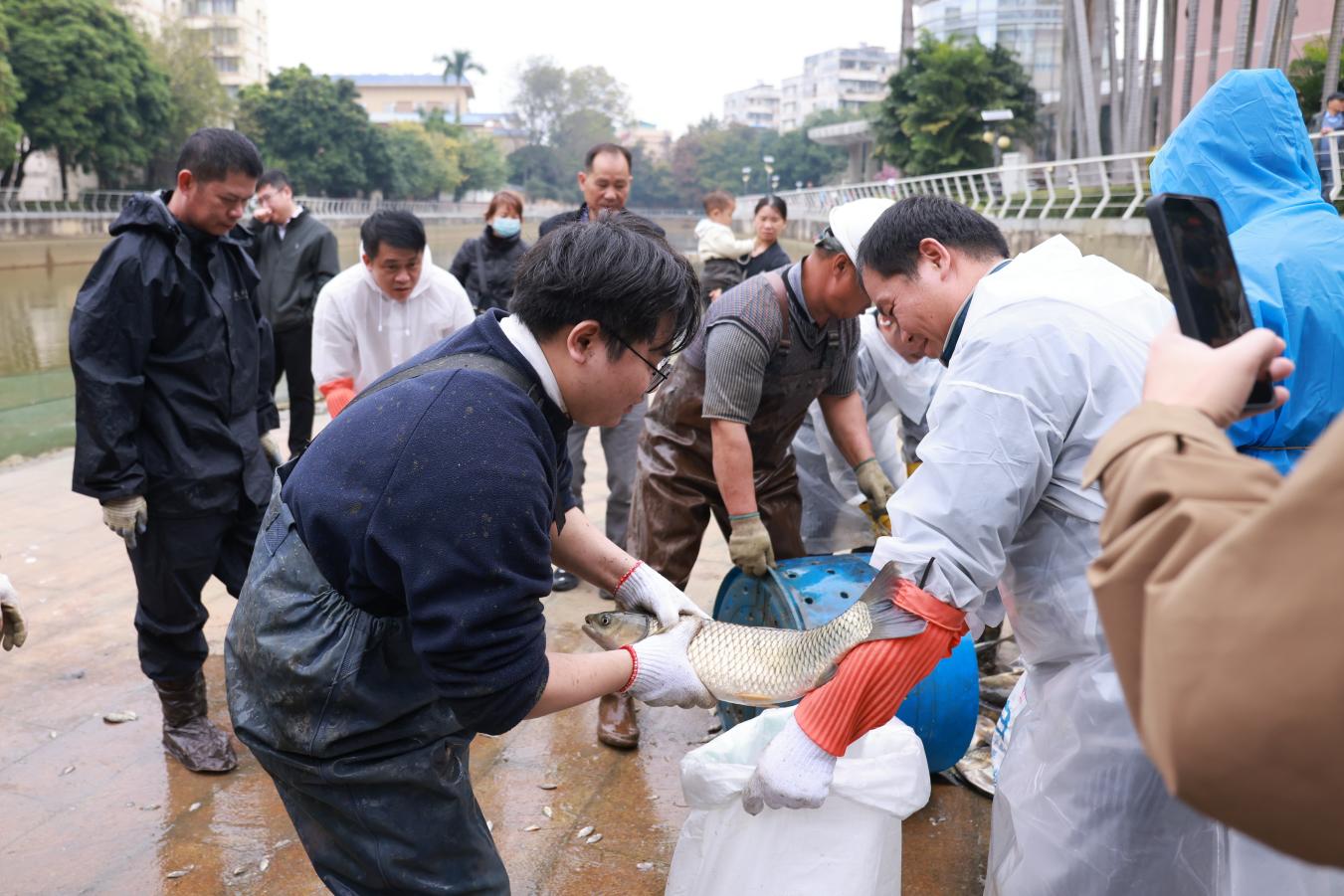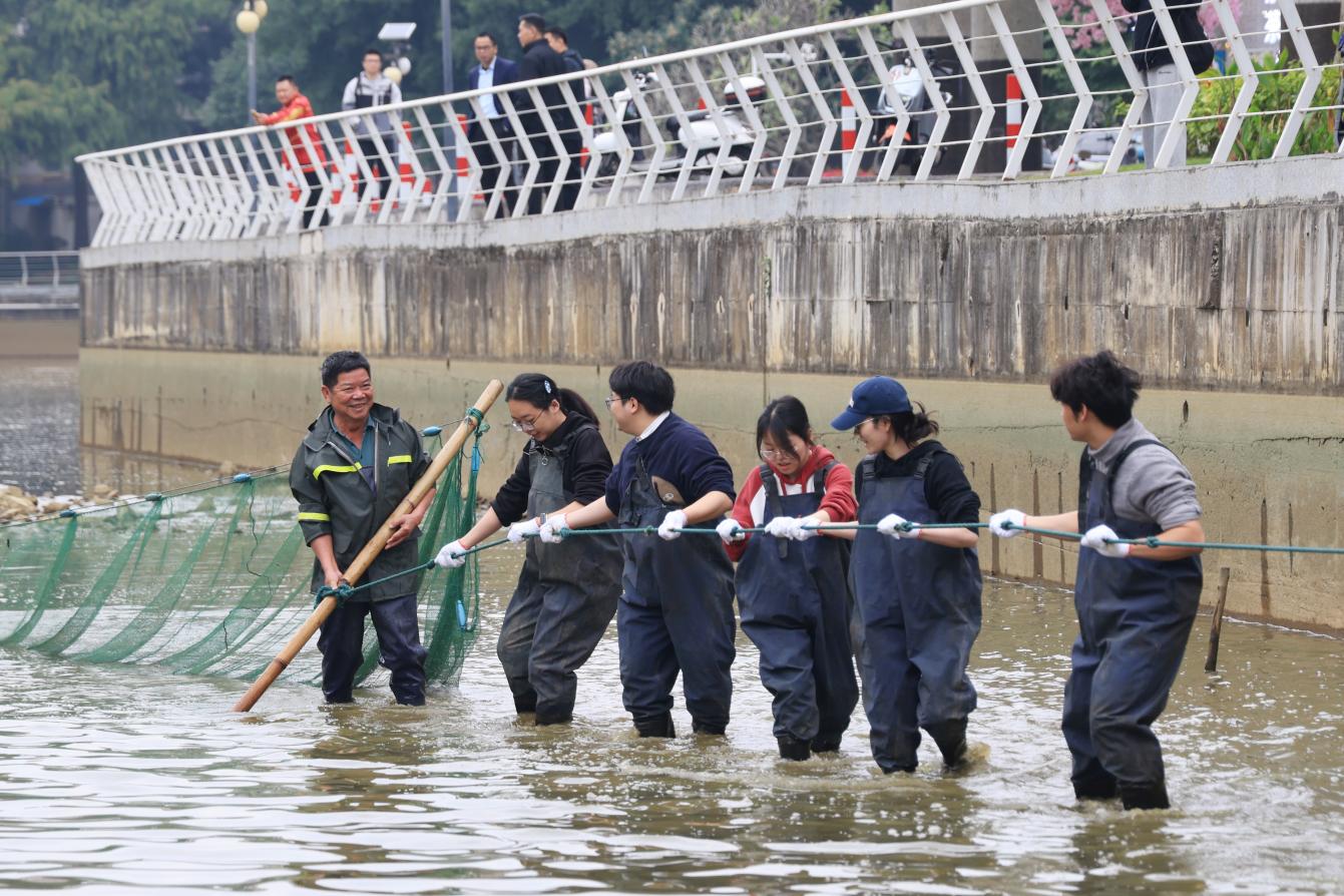 12月29日上午,一年一度的杏湖冬捕活动在Beat365中文官方网站南宁—校本部杏湖拉开序幕。学校校长曾志羽、副校长唐卫中、师生代表及离退休教职工齐聚湖畔,共同见证丰收场景。在专业人员的指导下,十余名学生参与了拉网、收鱼等捕捞环节。活动共捕捞“幸福鱼”(杏湖鱼)近8000斤,品种涵盖罗非鱼、草鱼、白鲢鱼、鲤鱼等。活动同步在南宁市融媒体中心新闻夜班相关账号开展直播,网络直播观看总人次100522人次。