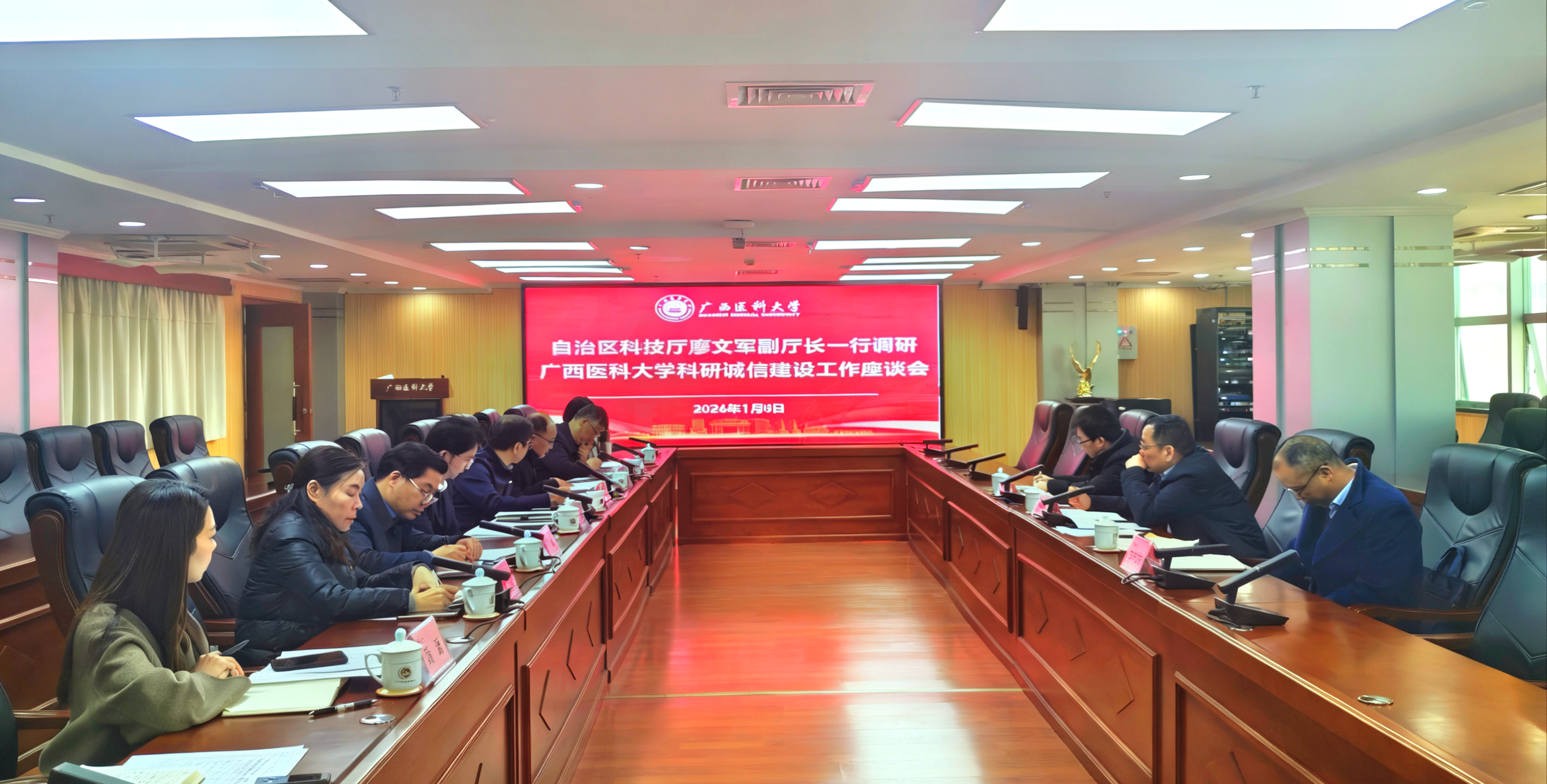 1月8日上午,自治区科技厅副厅长廖文军、监督评估与科研诚信处处长李时群、基础研究与创新平台处副处长唐炳汉一行到Beat365官网开展科研诚信建设专题调研并召开座谈会。Beat365官网副校长李浪出席会议并作汇报,各附属医院相关负责人参加调研座谈,科技处处长郭宏伟主持座谈会。