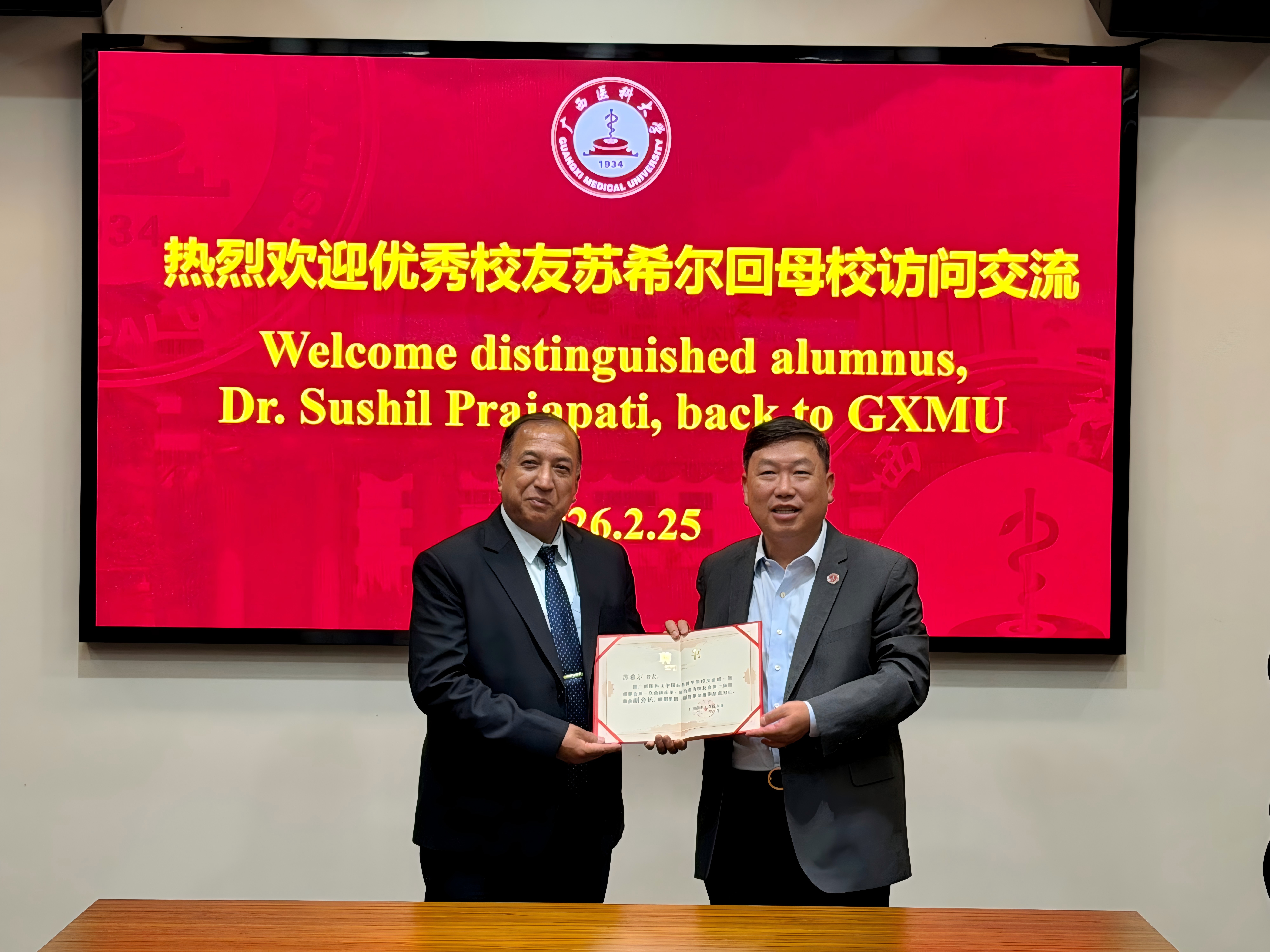 会后,陈俊强为苏希尔颁发国际教育学院校友会副会长聘书及纪念品。苏希尔一行参观了国际教育学院、第一附属医院医学模拟中心等地深入了解学校国际教育的发展情况。