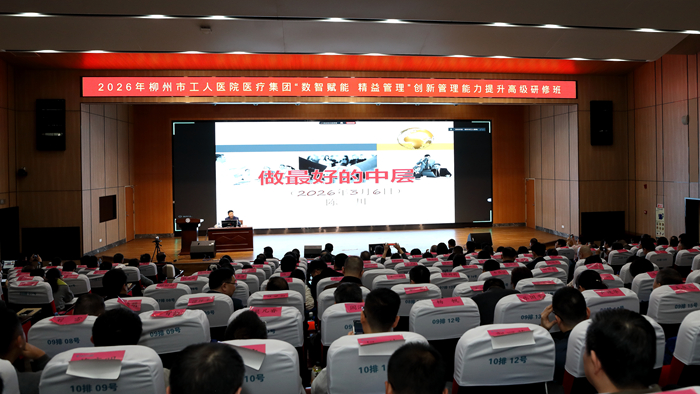 3月6日,2026年柳州市工人医院医疗集团“数智赋能 精益管理”创新管理能力提升研修班在柳州市开班。学校党委书记陈川应邀出席并作题为《做最好的中层》专题授课。柳州市工人医院医疗集团领导班子、各党支部书记、科主任及8家医联体单位中层以上干部700余名学员通过“线上+线下”方式参加。