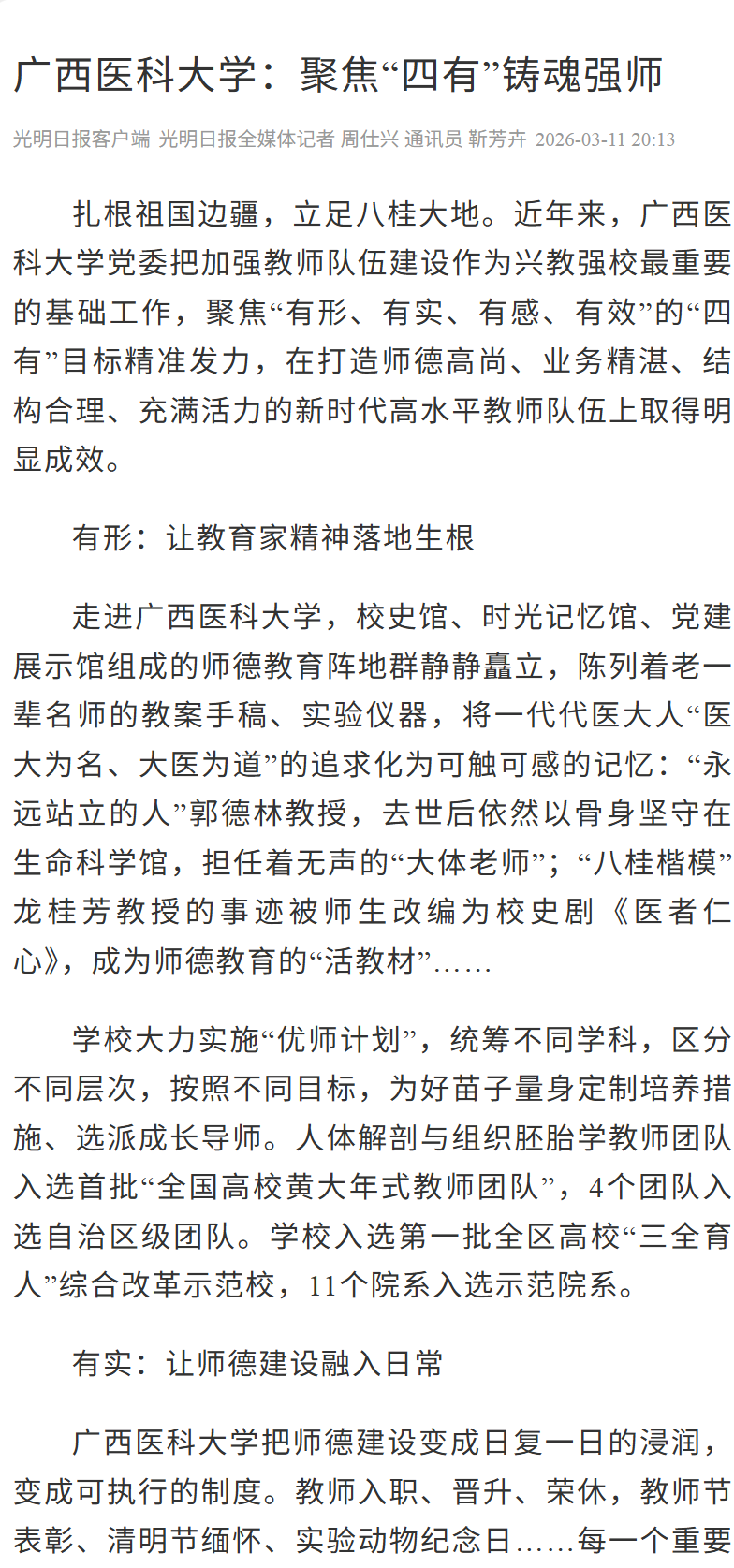 走进Beat365中文官方网站,校史馆、时光记忆馆、党建展示馆组成的师德教育阵地群静静矗立,陈列着老一辈名师的教案手稿、实验仪器,将一代代医大人“医大为名、大医为道”的追求化为可触可感的记忆:“永远站立的人”郭德林教授,去世后依然以骨身坚守在生命科学馆,担任着无声的“大体老师”;“八桂楷模”龙桂芳教授的事迹被师生改编为校史剧《医者仁心》,成为师德教育的“活教材”……