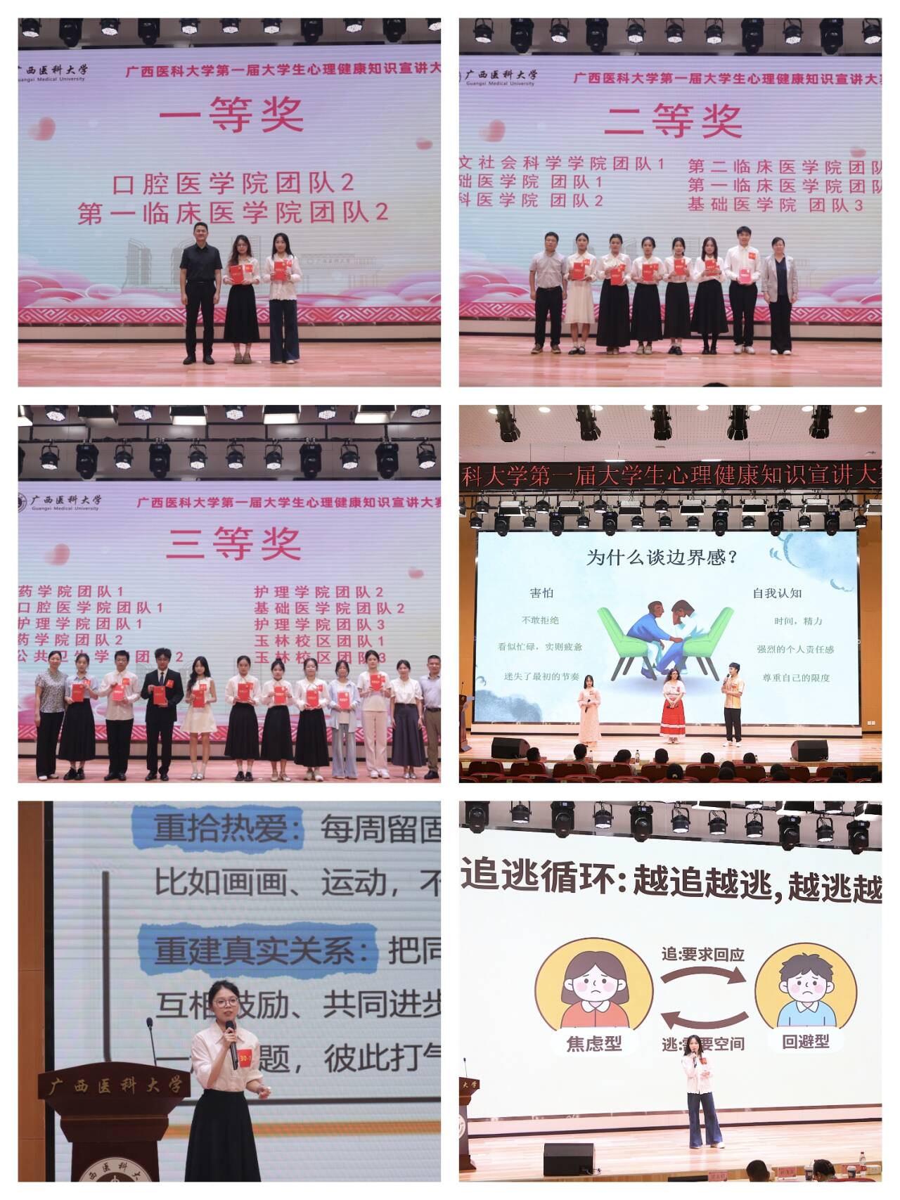 在“珍爱生命 逐光而行”第一届心理健康知识宣讲大赛决赛中,35支队伍围绕情绪管理、人际交往、压力调适等主题展开精彩宣讲。覃雄表示,医学生拥有强大心理韧性与精湛医术同等重要,希望同学们“以赛促学,以讲传爱,协同联动”。经激烈角逐,口腔医学院团队2、第一临床医学院团队1荣获一等奖,另有6支队伍获二等奖、10支获三等奖、17支获优秀奖。