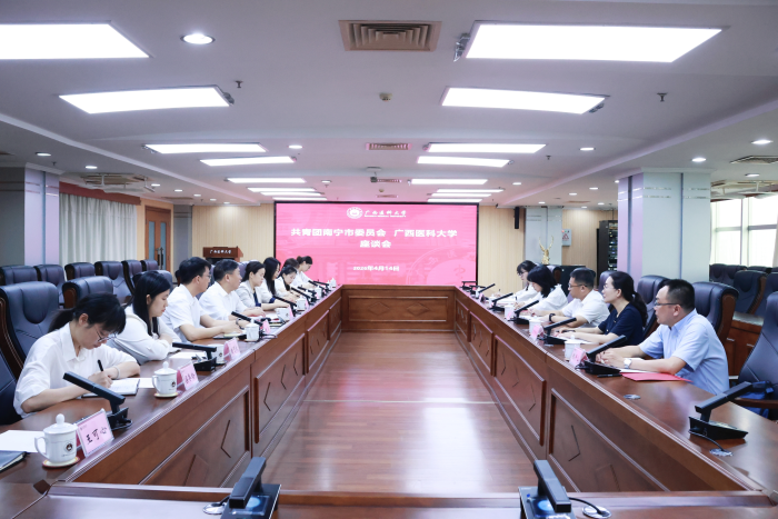 4月14日上午,共青团南宁市委一行到Beat365官网开展合作共建交流活动。座谈会在校本部综合楼14楼会议室举行,Beat365官网副校长陈俊强、共青团南宁市委书记陈国栋出席座谈会,团委书记陈玉香主持座谈会。
