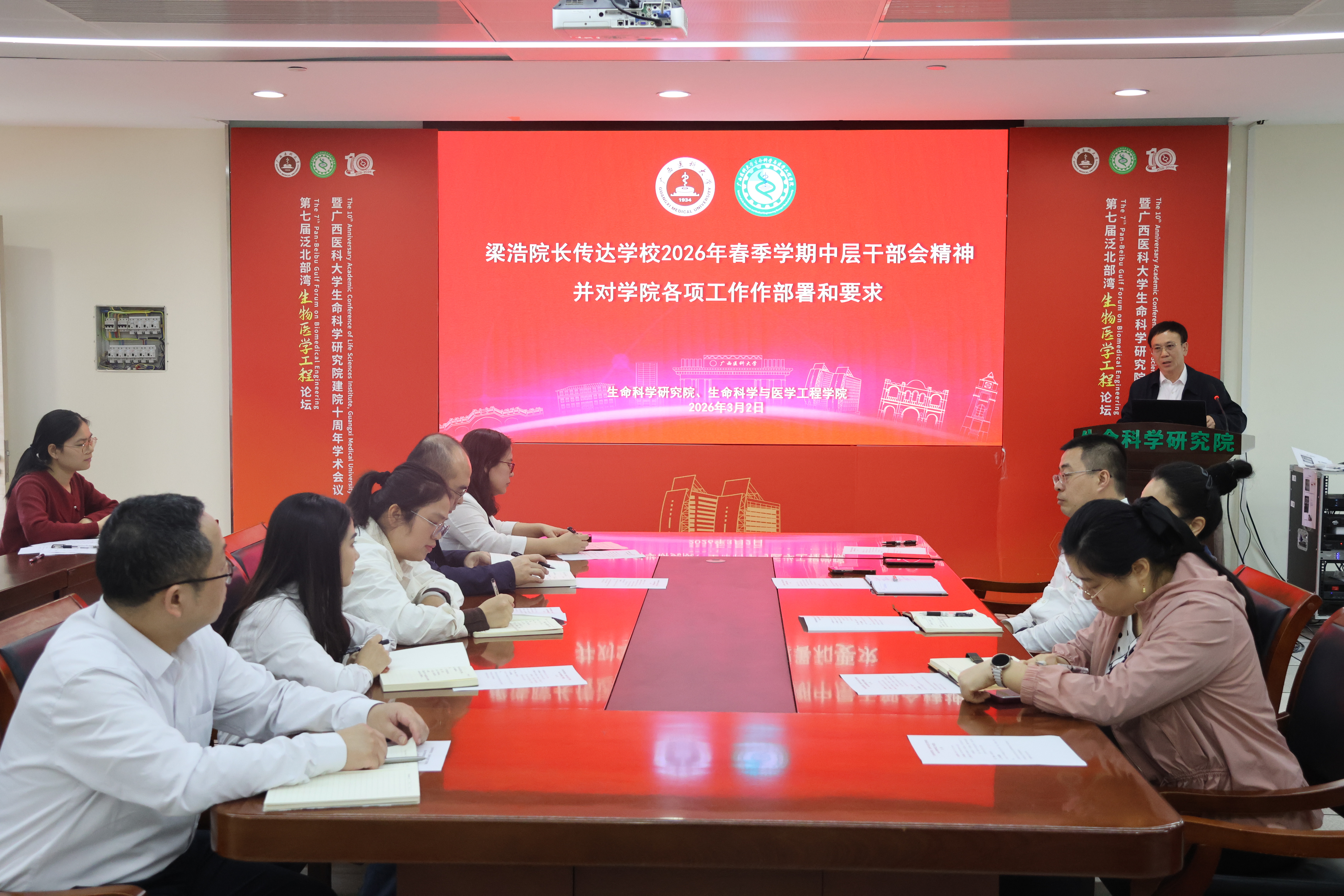 为传达学校新学期工作部署会议精神,明确新学期发展目标,3月2日下午,生命科学研究院、生命科学与医学工程学院在科技楼501会议室召开2026年春季学期工作布置会。学院党政领导班子,医学实验中心全体教职工、各研究中心/重点实验室负责人及代表参加了会议。会议由学院党委书记陈国湘主持。