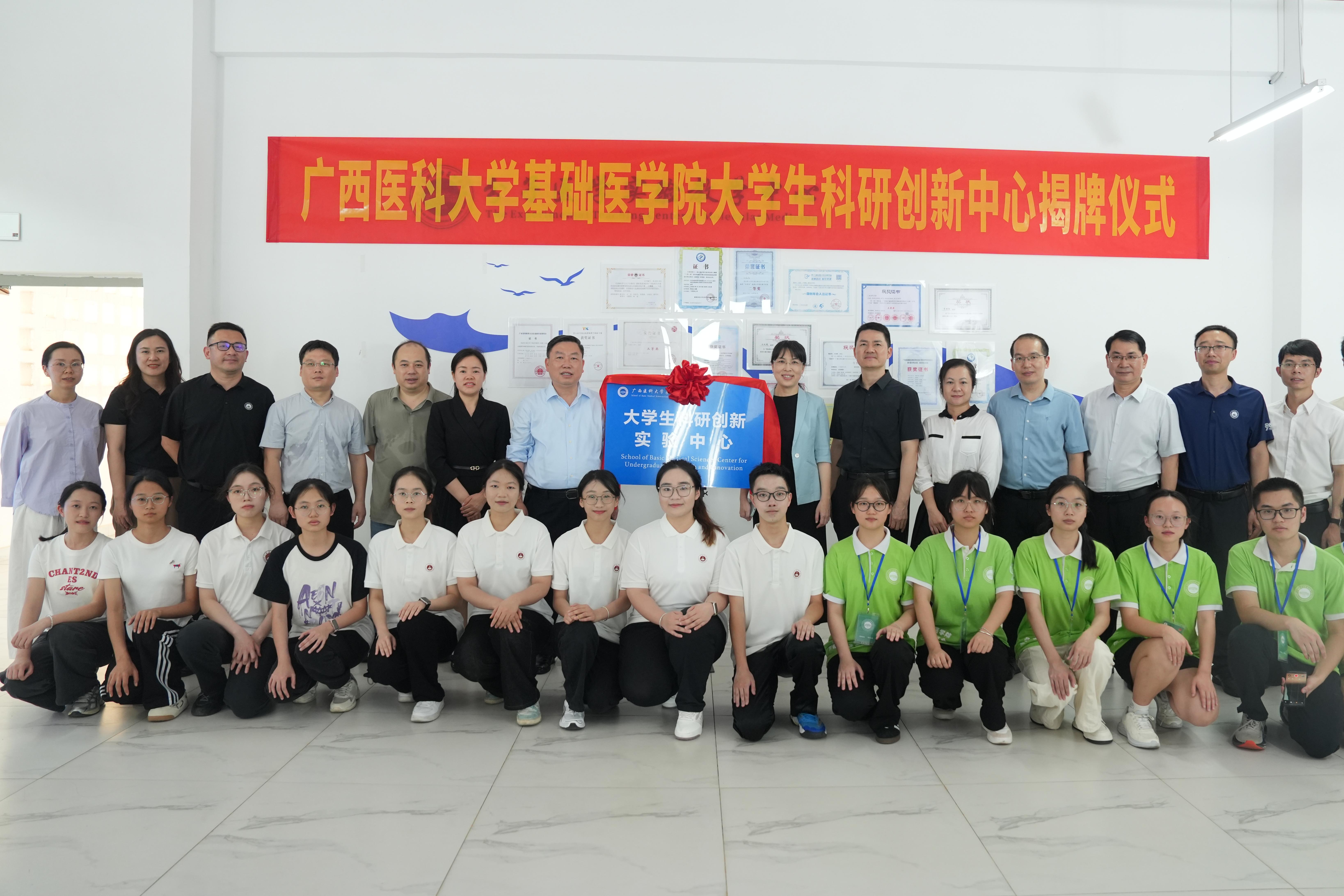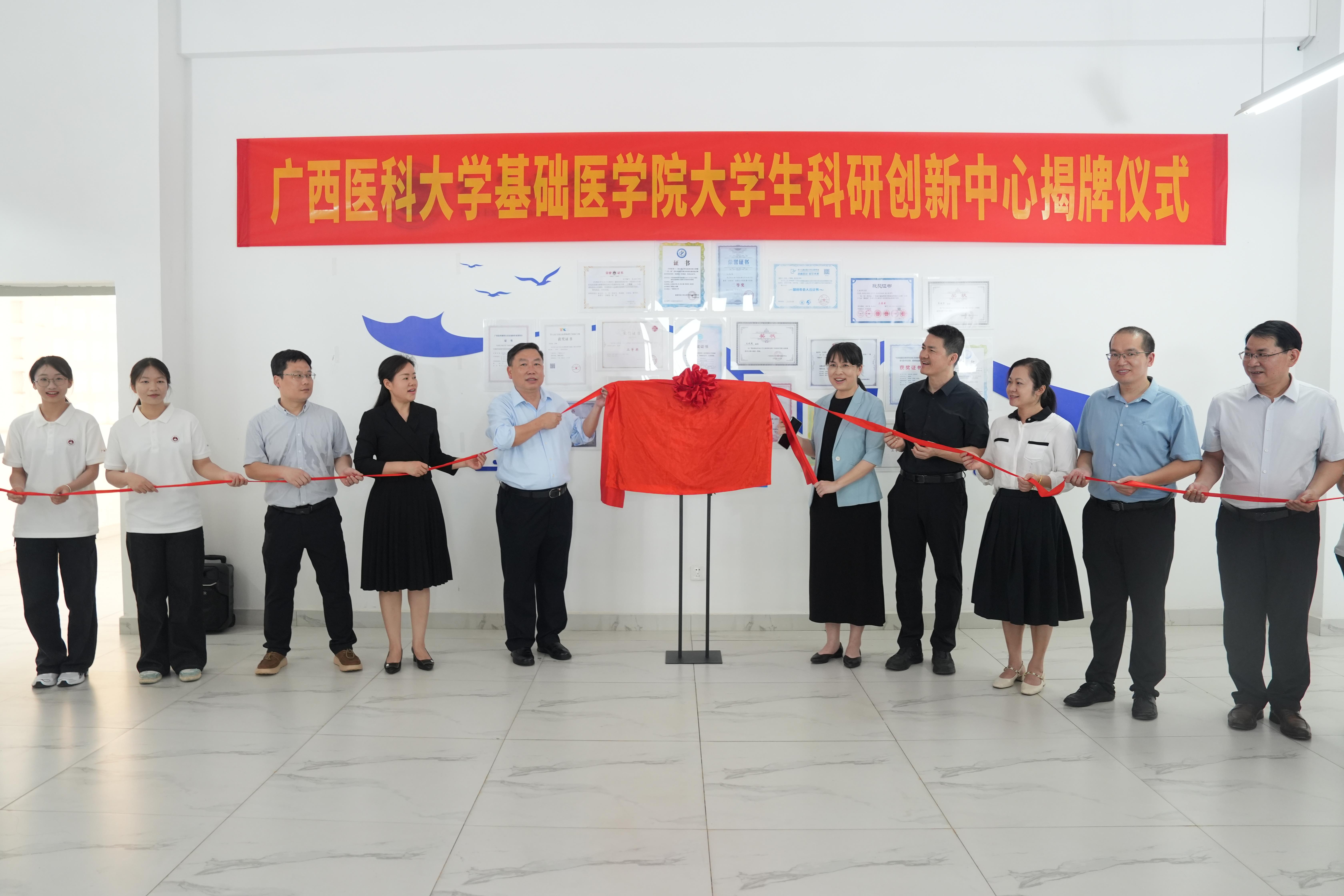 4月12日,基础医学院大学生科研创新实验中心揭牌仪式在武鸣校区举行。学校副校长陈俊强出席,学工部(处)、校团委、教务处、武鸣校区管理中心相关负责人,以及基础医学院领导班子成员、师生代表共同参加活动。