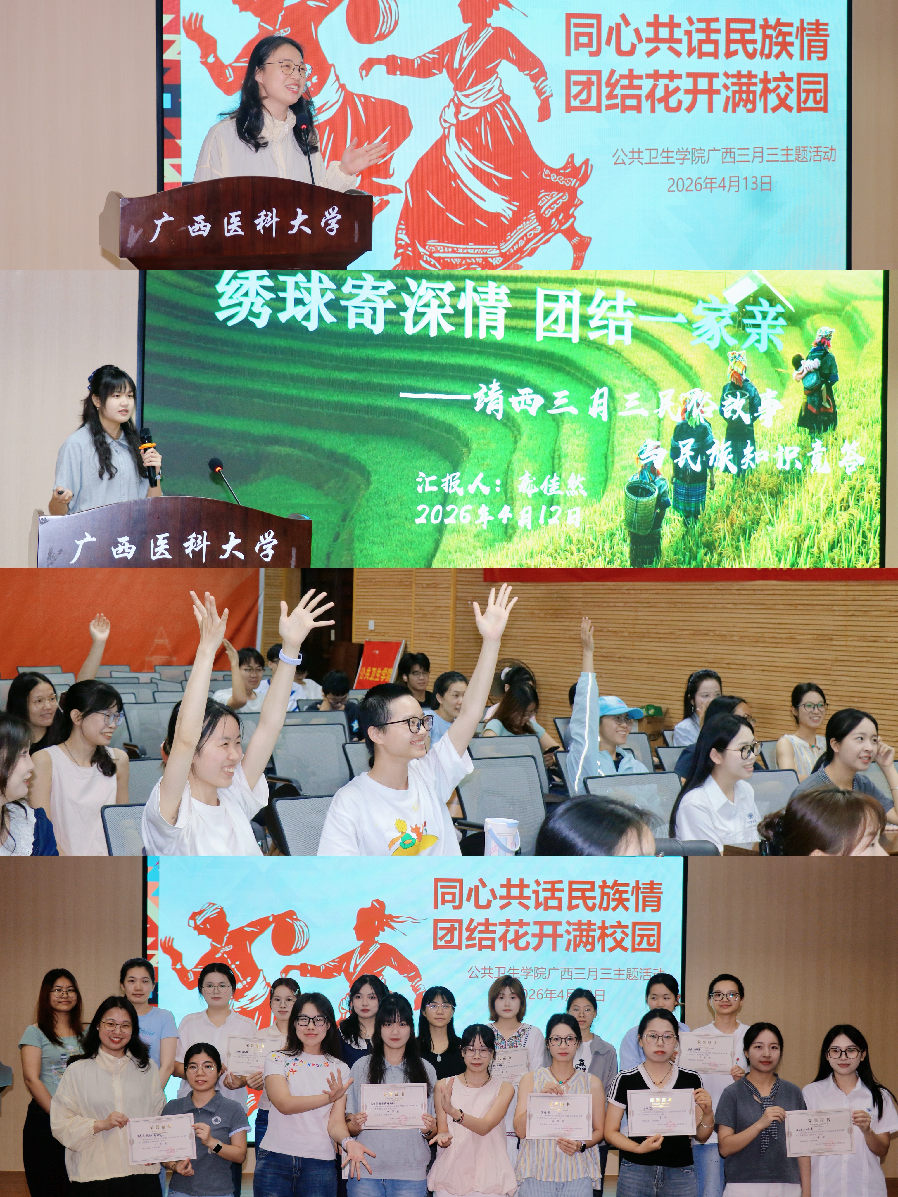 为传承中华优秀传统文化,铸牢中华民族共同体意识,2026年4月10日至13日,公共卫生学院于校本部及武鸣校区举办“广西三月三”系列民俗体验活动。活动紧扣“三月三壮韵牵情脉,筑民族同心向未来”主题,两校区联动开展多元体验,让民族团结之根深植青年心田。