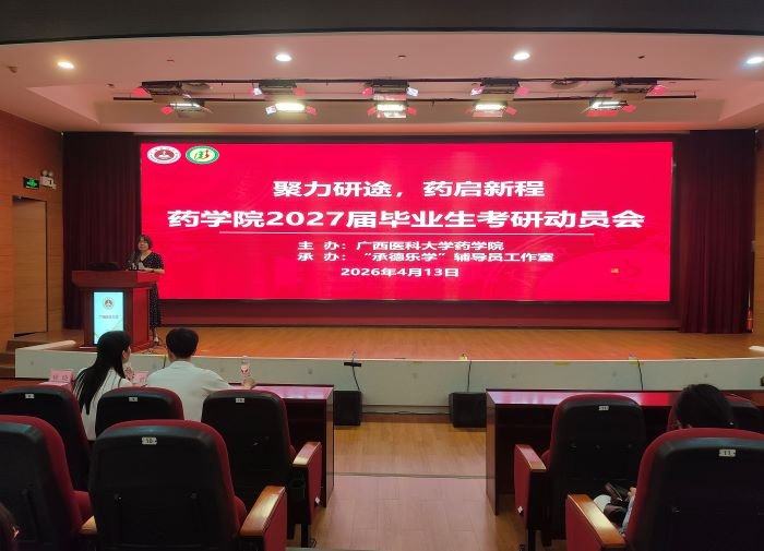 为鼓励学院2027届毕业生积极投身考研,提振备考热情与信心,解答备考过程中的各类疑惑,4月13日,药学院于科技楼报告厅召开2027届毕业生考研动员大会。药学院院长阳洁、党委副书记林晓、学工办主任谭斌出席会议,会议由林晓主持,辅导员刘乃钰,2027届全体毕业生共330余人参会。