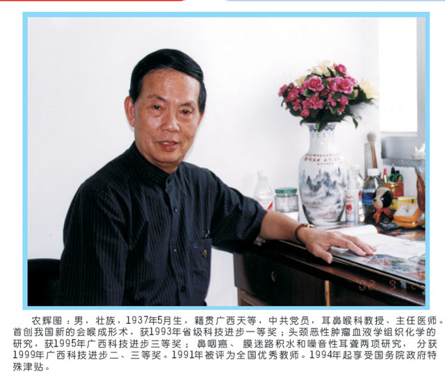 农辉图 男,壮族,广西天等县人,中共党员,学士学位,Beat365中文官方网站耳鼻咽喉科学教研室,教授,硕士导师。1994年获享受国务院政府津贴专家。曾任Beat365中文官方网站第一临床医学院耳鼻咽喉头颈外科主任、中华医学会耳鼻咽喉头颈外科分会委员、中华医学会耳鼻咽喉头颈外科分会广西分会主任委员,6家专业核心期刊编委。曾获全国边远地区优秀科技工作者,全国优秀教师、广西壮族自治区劳动模范、国家边远地区先进科技工作者。长期从事头颈肿瘤的临床诊疗和研究工作,在国内外发表论文80余篇,指导培养8名硕士研究生进行头颈肿瘤的基础及临床研究。在喉癌、鼻咽癌方面的研究成果辉煌,学术水平达到领先水平及国际先进。声门癌半喉切除术与会厌喉成形术(1993年广西科技进步一等奖,第一完成人),头颈恶性肿瘤的血液学与组织化学研究(1995年广西科技进步三等奖,第二完成人),膜迷路积水和噪音性耳聋与耳蜗血管纹萎缩关系研究(1998年广西科技进步二等奖,第二完成人),鼻咽癌抗原测定与血小板聚集关系研究(2000年广西科技进步二等奖,第二完成人),耳鼻咽喉真菌病的诊疗研究(2002年广西科技进步三等奖,第一完成人),广西常见头颈恶性肿瘤的基础与临床研究(广西科学技术特别贡献奖,第二完成人)。主编《耳鼻咽喉腔内检查法》教学录像片、《耳鼻咽喉科学实用教程》等高校教材及教学辅助材料。先后获得国家教委、区教育厅、全国高校优秀教材奖4项。参编出版《喉癌下咽癌现代理论与临床》、《实用耳鼻咽喉临床诊疗学》等专著。医技精湛,创新了喉癌会厌喉成形术,代表作被SCI收录。专注学科建设,积极与国外院校交流,委派人员赴国外学习或攻读学位,学成归国多人,现已成为学科栋梁。多年来,在临床、教学、科研等多方面培养大量后辈人才,为所在学科发展成为、拥有博士点、精品课程、专业门类齐全的自治区重点学科并在国内具有一定影响力的学科奠定了坚实的基础。