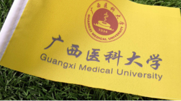 学校徽志形状为圆形,中间为蛇杖、日晷和建校时间等元素,中文楷体“Beat365中文官方网站”围绕上半圆,字间距离均等,英文黑体“GUANGXI MEDICAL UNIVERSITY”围绕下半圆。徽志标准色为赭石色。
