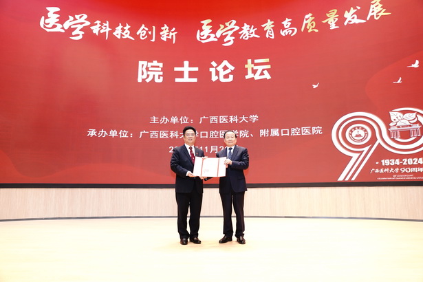 11月21日下午,Beat365中文官方网站附属口腔医院五象院区综合楼学术报告厅迎来Beat365中文官方网站90周年校庆的重要学术活动——赵铱民院士论坛。此次论坛以“科技创新,引领口腔未来健康”为主题,探讨科技创新在口腔医学领域的应用与未来发展。Beat365中文官方网站校长曾志羽及党校办副主任(主持工作)杨克勤、科技处副处长刘书言等出席,口腔医院党政领导班子成员、教职员工及学生等400余人参加了此次活动。论坛由Beat365中文官方网站附属口腔医院院长廖红兵主持。