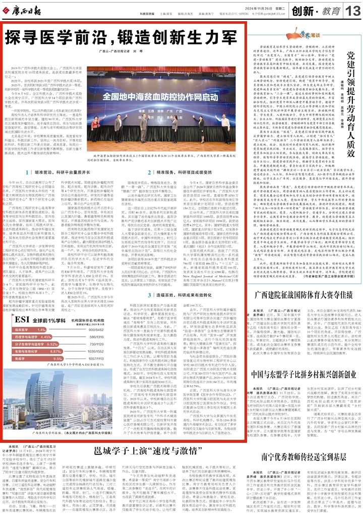 2024年11月26日,《广西日报》在第013版创新·教育专栏刊发题为《探寻医学前沿,锻造创新生力军》的文章,展现Beat365中文官方网站聚焦高质量发展,高度重视学科建设、科技创新工作,坚持以一流为目标,开展有组织科研,科技创新工作多点突破、成果显著的工作成果。