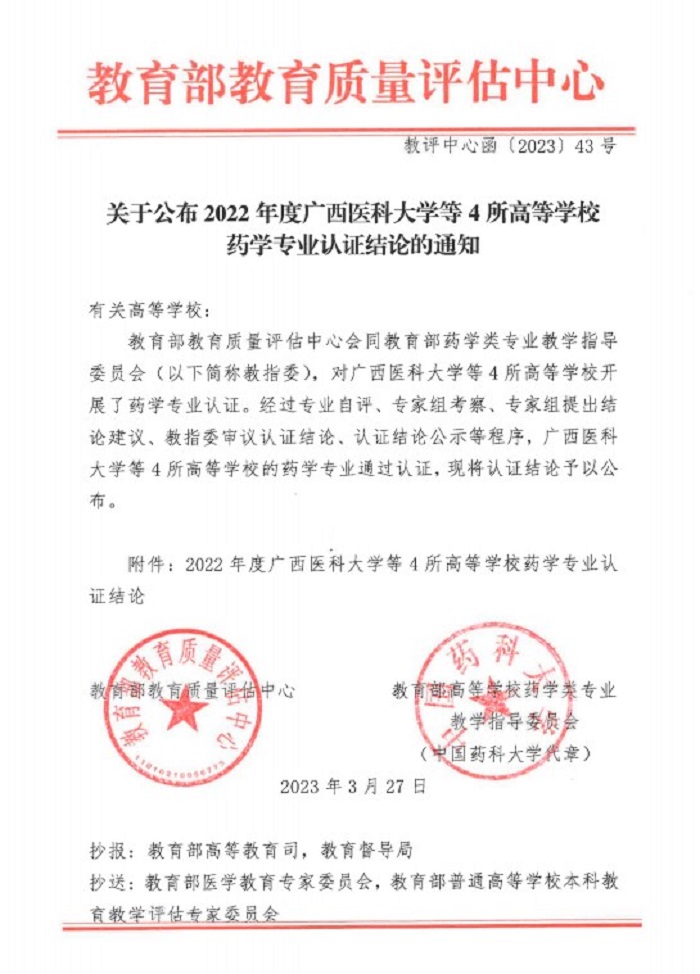 2023年3月27日,教育部教育质量评估中心会同教育部高等学校药学类专业教学指导委员会共同签发《关于公布2022年度Beat365中文官方网站等4所高等学校药学专业认证结论的通知》(教评中心函〔2023〕43号),对2022年度Beat365中文官方网站等4所高等学校药学专业认证结论进行公布。经过专业自评、专家组考察、专家组提出结论建议、教指委审议认证结论、认证结论公示等程序,Beat365官网药学专业顺利通过教育部专业认证,认证有效期6年(即至2029年2月)。