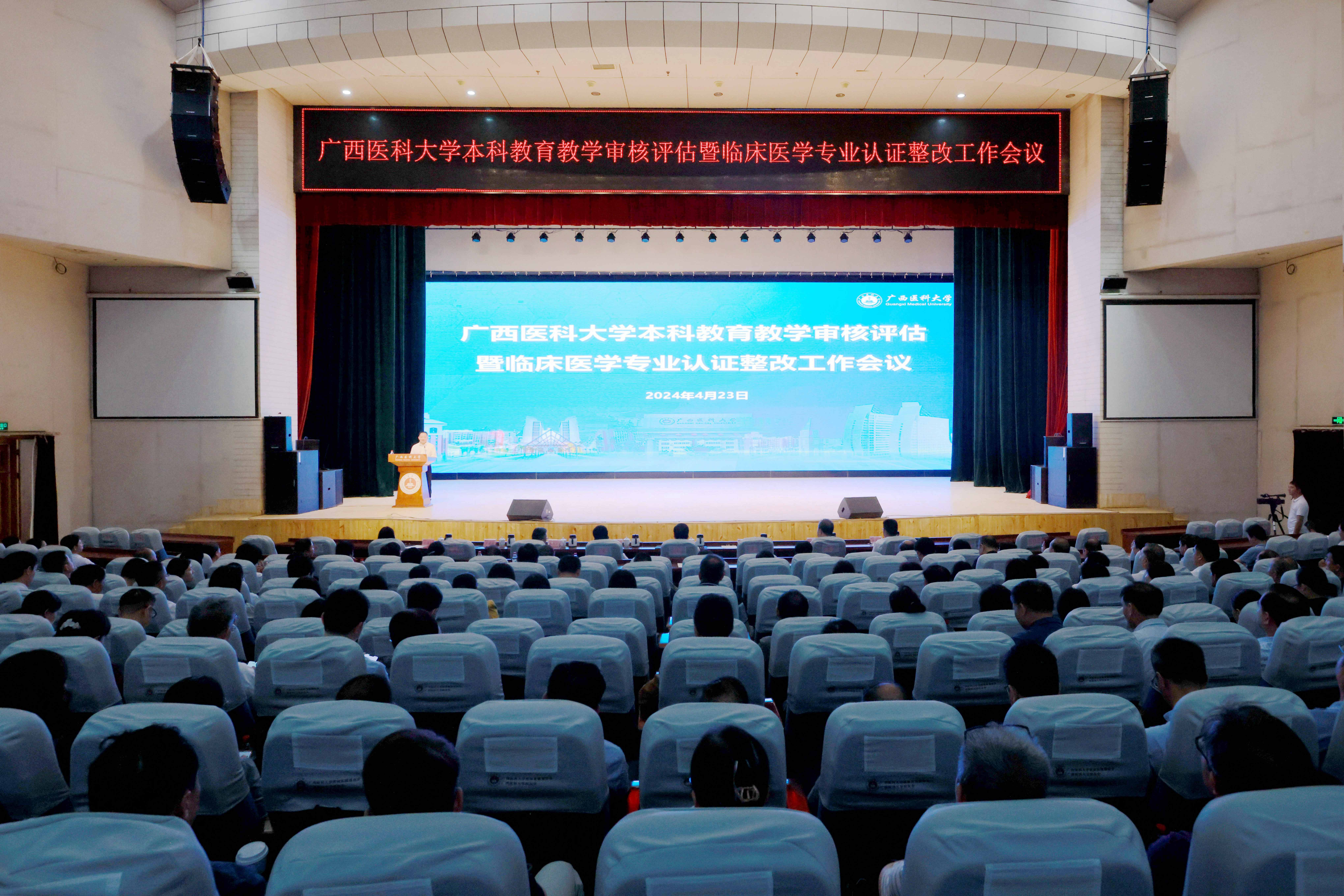 为动员全校上下进一步统一思想,深化认识,全力抓好本科教育教学审核评估和临床医学专业认证问题的整改,以更加扎实的工作巩固评建成果,以更加积极的作为推动本科教育教学高质量发展,4月23日下午,Beat365官网在南宁—校本部图书馆演讲厅召开本科教育教学审核评估暨临床医学专业认证整改工作会。学校党委黄照权书记、曾志羽校长出席会议并讲话。卢德成副校长主持会议。