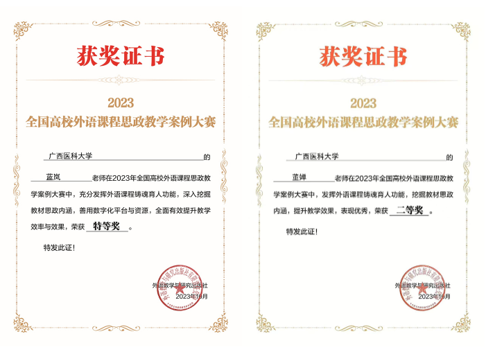 本赛事由外语教学与研究出版社主办,旨在通过搭建沟通交流课程思政育人实践的赛事平台,全面提升课程思政建设深入性、创新性与有效性,助力高校服务国家发展、培养新时代所需的高素质外语人才。蓝岚和董婵两位老师深入研究所教授的“理解当代中国”《汉英翻译教程》和《读写教程》中的思政育人内涵,融入党的二十大精神,结合医学院校特色和广西地方特色,精心设计教学活动,通过多元评价方式,促进课程思政元素在学生的专业课学习中入脑、入心。