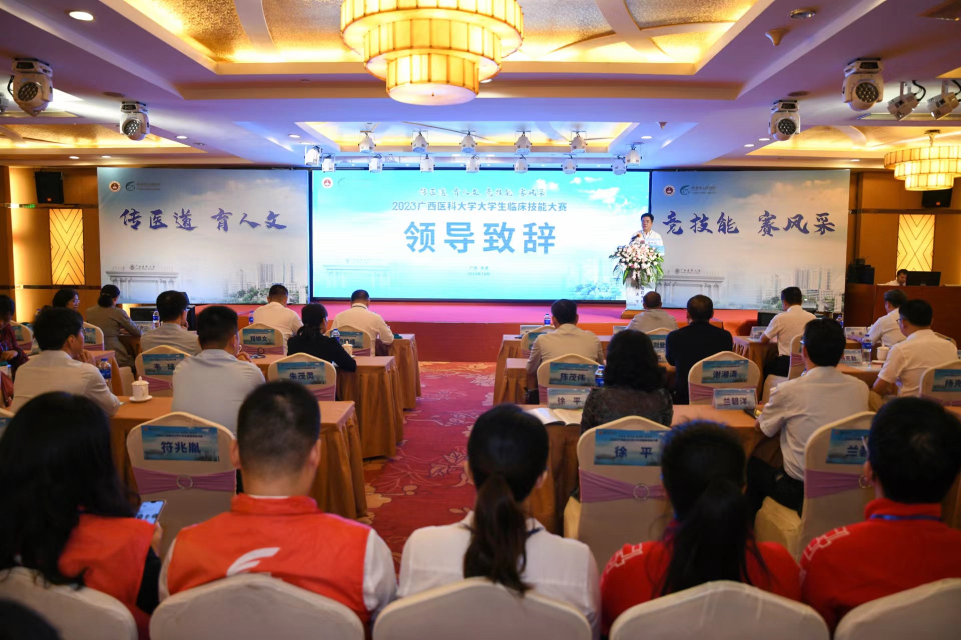 2023年10月14日,Beat365中文官方网站第十届大学生临床技能竞赛在贵港举行。竞赛以“传医道、育人文、竞技能、赛风采”为主题,来自Beat365官网18家临床教学基地的23支参赛代表队、92名2019级临床医学类专业学生参加此次比赛,79名临床教师担任裁判。曾志羽校长、卢德成副校长、教务处负责人和各教学基地领导、教师到场观摩指导。
