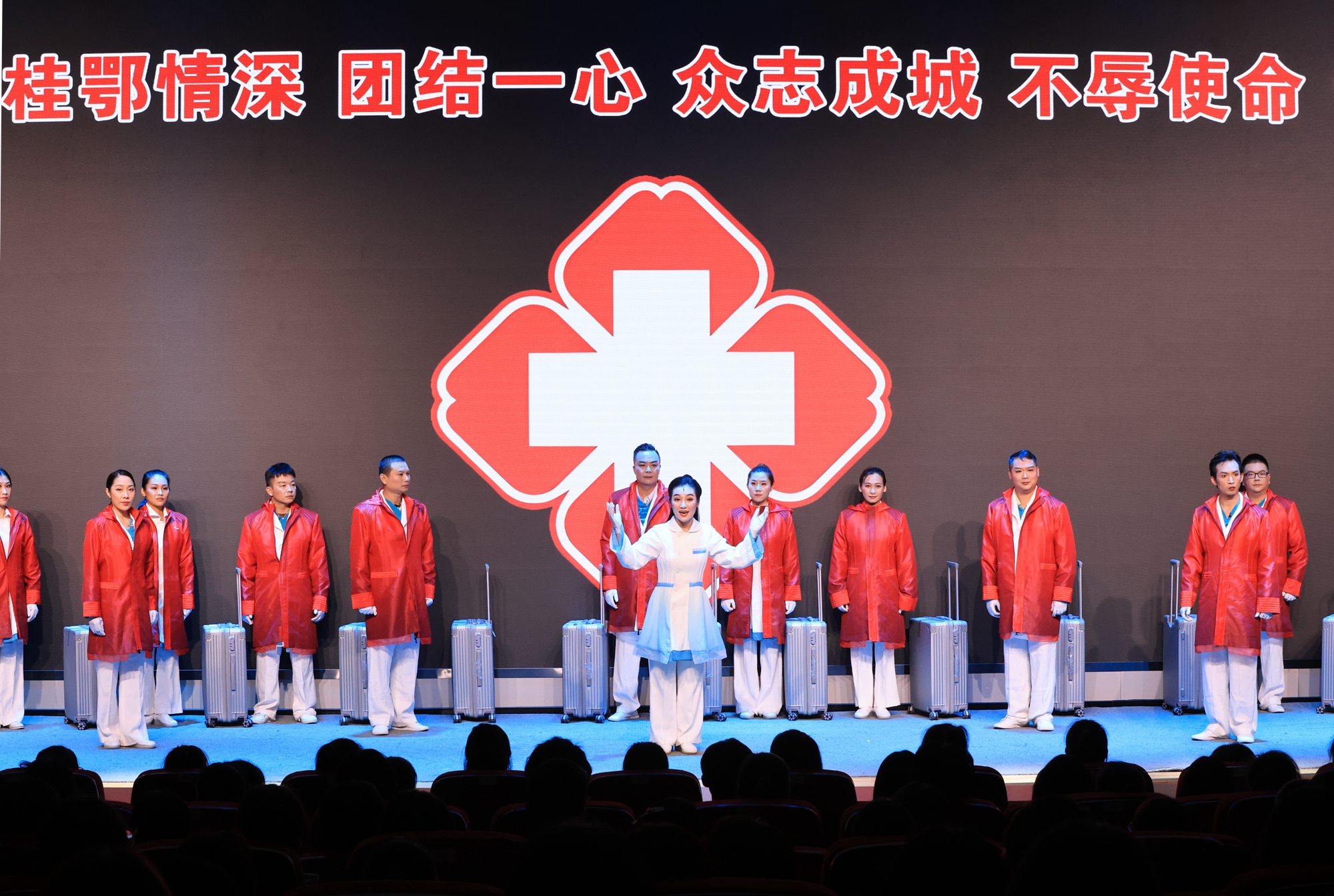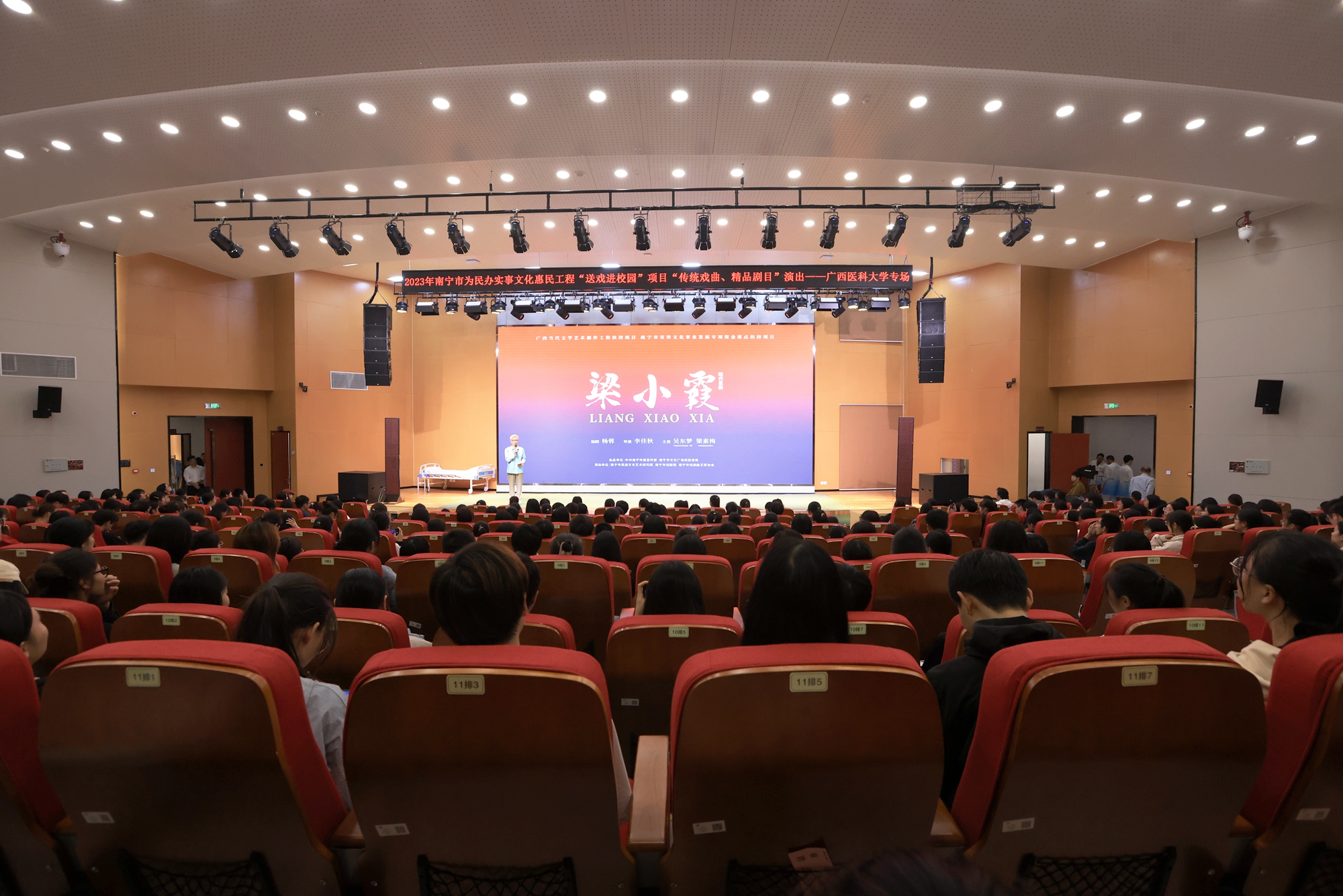 为致敬抗疫英雄,弘扬伟大抗疫精神,进一步以优秀的传统艺术形式丰富校园文化,提高师生艺术修养,以优秀校友的先进事迹勉励学子苦练技能本领,坚定理想信念,11月9日晚,由中共南宁市委宣传部、南宁市文化广电和旅游局出品,南宁市民族文化艺术研究院演出的现代邕剧《梁小霞》在Beat365官网武鸣校区图书馆报告厅精彩上演。Beat365官网师生代表400余人观看了演出。