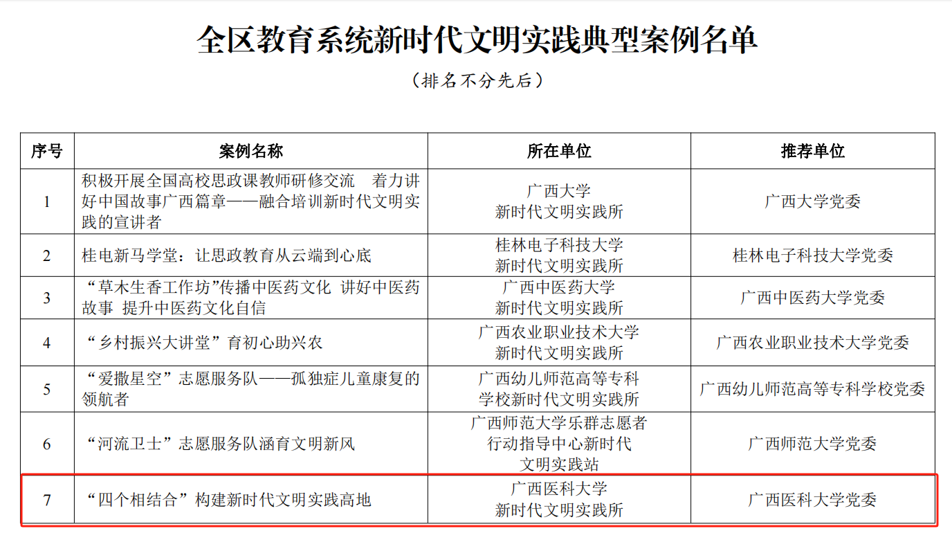 近日,自治区党委教育工委公布了全区教育系统新时代文明实践典型案例名单,Beat365官网新时代文明实践所《“四个相结合” 构建新时代文明实践高地》案例成功入选。据悉,本次活动开展以来,自治区党委教育工委共收到各设区市党委教育工委(教育局党组)推荐报送的典型案例46份,各高校党委推荐报送的典型案例104份。经组织评审,共评选出全区教育系统新时代文明实践典型案例54个。