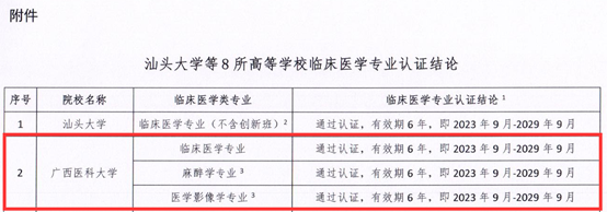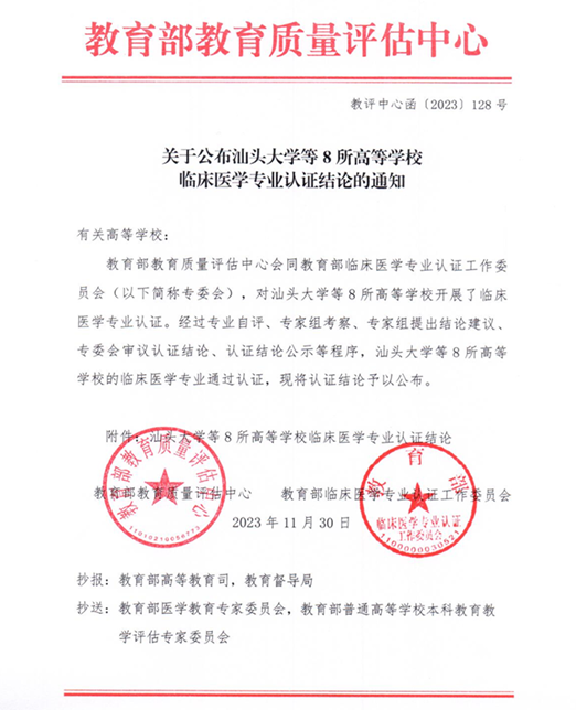 近期,教育部教育质量评估中心、教育部临床医学专业认证工作委员会发布《关于公布汕头大学等8所高等学校临床医学专业认证结论的通知》(教评中心函﹝2023﹞128号),正式公布8所高等学校临床医学专业认证结论,Beat365官网临床医学、麻醉学、医学影像学等3个临床医学类专业通过认证,认证有效期6年。