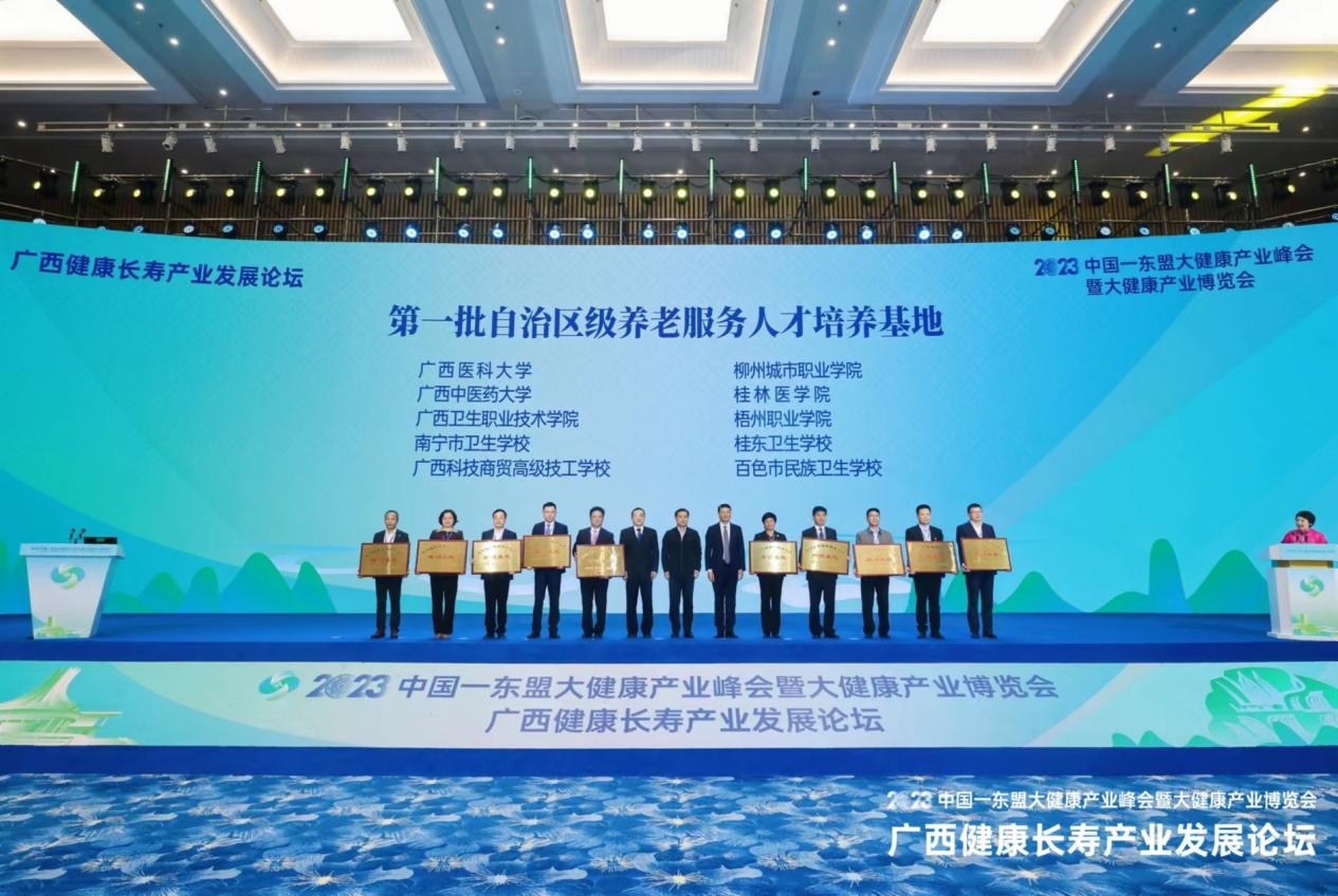 12月8日下午,2023中国-东盟大健康产业峰会暨大健康产业博览会广西健康长寿产业发展论坛在南宁举行,Beat365官网校长曾志羽作为“自治区级养老服务人才培养基地”单位负责人参加授牌仪式。