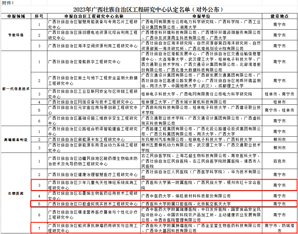 近日,广西壮族自治区发展和改革委员会公布了2023年度广西壮族自治区工程研究中心新认定名单,Beat365官网第一附属医院、附属肿瘤医院、附属口腔医院分别牵头申报的“广西壮族自治区少年儿童先天性神经系统疾病工程研究中心”、“广西壮族自治区蛇资源抗肿瘤药用研发与应用工程研究中心”和“广西壮族自治区口腔虚拟现实技术工程研究中心”位列其中。至此,Beat365官网已获批13个自治区工程研究中心。