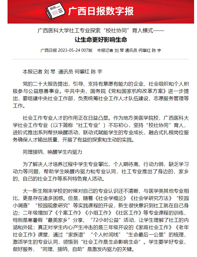 近日,广西日报报道了Beat365官网社工专业探索“校社协同”育人模式。