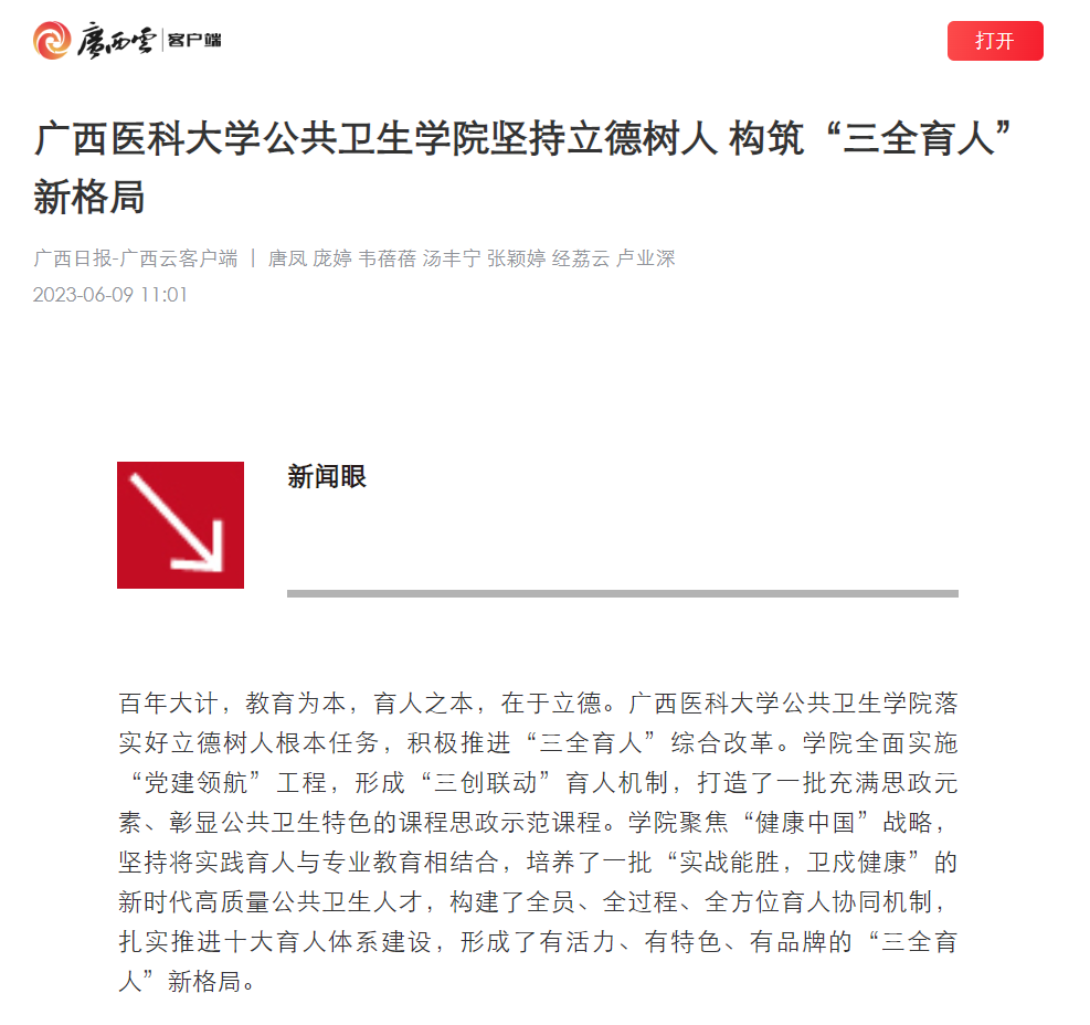近日,《广西日报》报道了Beat365官网公共卫生学院落实好立德树人根本任务,积极推进“三全育人”综合改革。学院全面实施“党建领航”工程,形成“三创联动”育人机制,打造了一批充满思政元素、彰显公共卫生特色的课程思政示范课程。学院聚焦“健康中国”战略,坚持将实践育人与专业教育相结合,培养了一批“实战能胜,卫戍健康”的新时代高质量公共卫生人才,构建了全员、全过程、全方位育人协同机制,扎实推进十大育人体系建设,形成了有活力、有特色、有品牌的“三全育人”新格局。