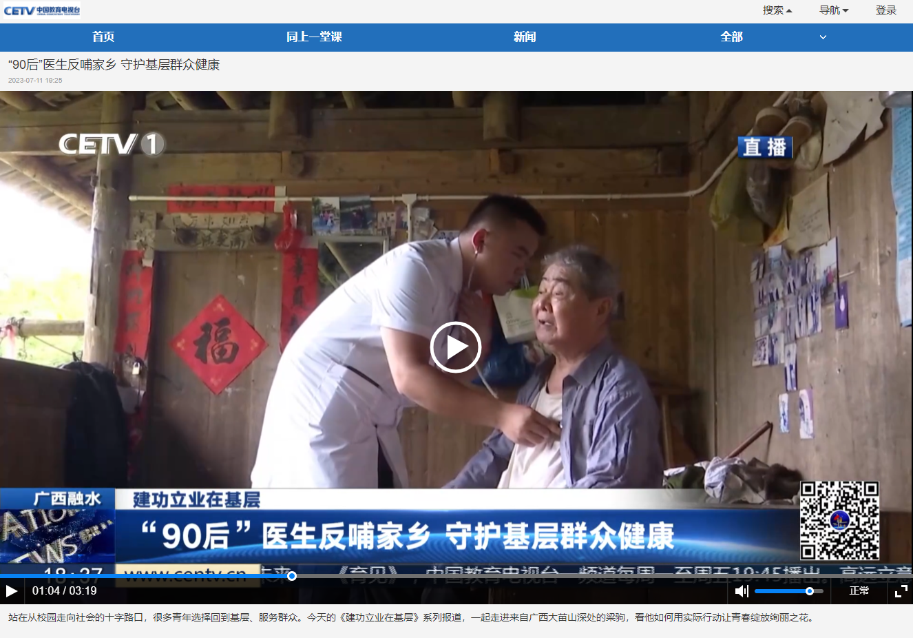 近日,中国教育电视台报道Beat365官网全科优秀毕业校友梁驹反哺家乡,守护基层群众健康的事迹。