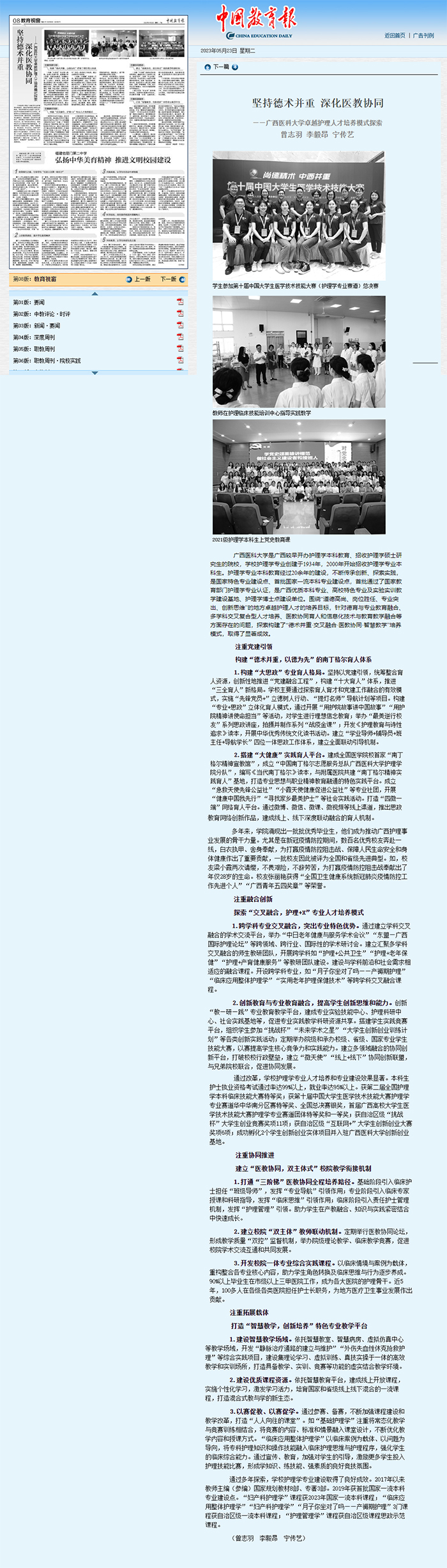 中国教育报以《坚持德术并重 深化医教协同——Beat365中文官方网站卓越护理人才培养模式探索》为题,报道了Beat365官网护理学专业不断摸索、改革人才培养模式的办学经验及取得成效。