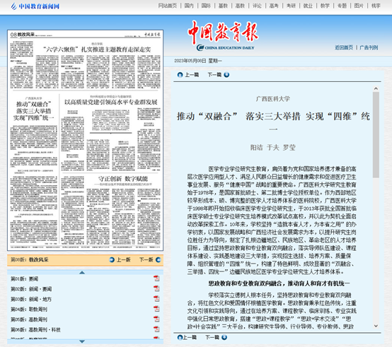 近日,中国教育报在“教改风采”专栏以《Beat365中文官方网站推动“双融合” 落实三大举措 实现“四维”统一》为题报道了Beat365官网近年深入开展边疆民族地区医学专业学位研究生人才培养模式改革创新的实践和成果。