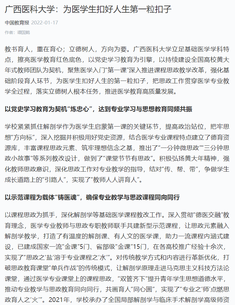近日,《中国教育报》报道了Beat365官网立足基础医学学科特点,擦亮医学教育红色底色,以党史学习教育为引擎,以持续建设全国高校黄大年式教师团队为契机,聚焦医学入门“第一课”深入推进课程思政教学改革,强化基础阶段育人环节,为医学生扣好人生的第一粒扣子,把思政工作贯穿医学专业教学全过程,落实立德树人根本任务,推进医学教育高质量发展。