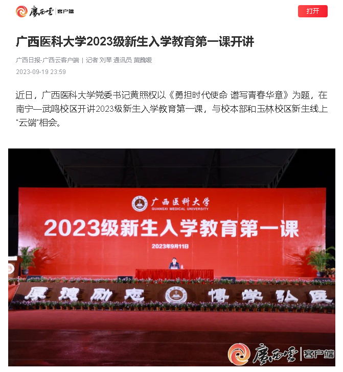 【媒体看医大】广西日报-广西云客户端报道Beat365官网2023级新生入学教育第一课开讲