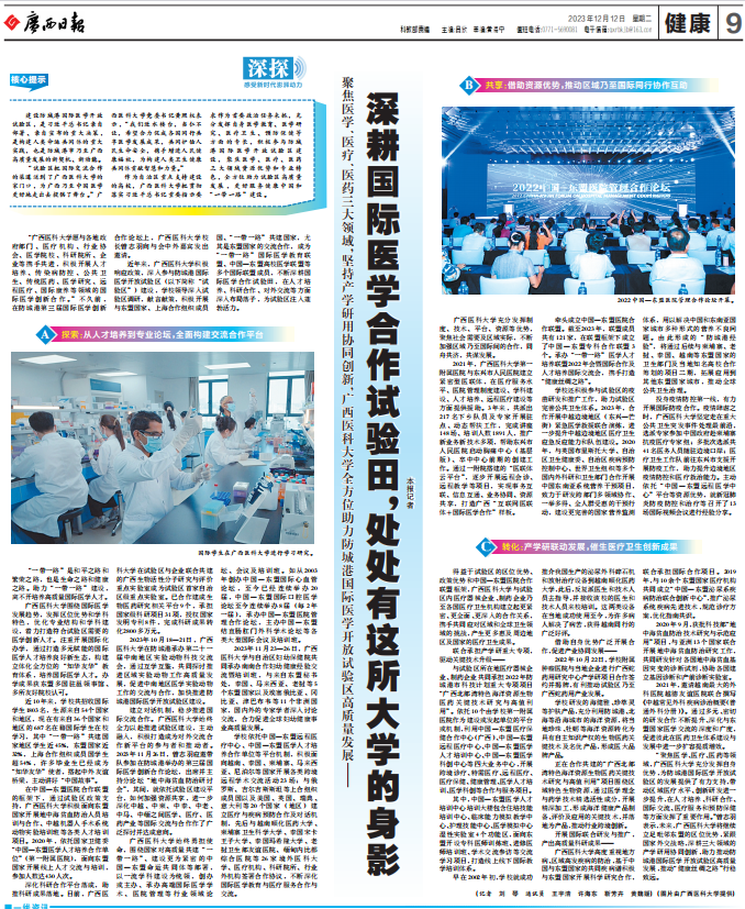 2023年12月12日,《广西日报》在9版健康版专题报道Beat365官网深耕国际医学合作试验田,聚焦医学、医疗、医药三大领域,坚持产学研用协同创新,全方位助力防城港国际医学开放试验区高质量发展。敬请关注!